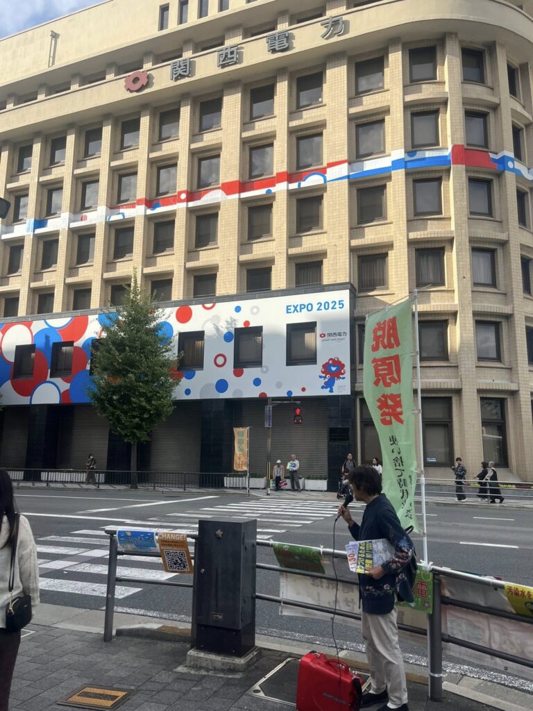- 使い捨て時代を考える会の11日行動…毎月11日、関電京都支社の前で、地震が起こった時刻14:46から1時間のアピール。正面玄関あたりの黒い石は、福島県田村市産の中山石。(福島原発事故では田村市から京都に避難していた人もいました)
